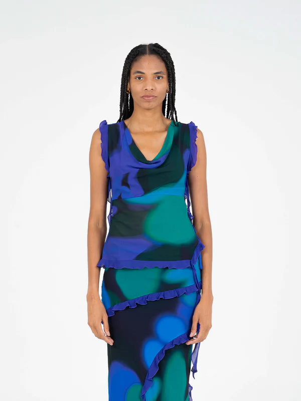 Blusa estampada sin mangas. Pequeña abertura lateral y detalles de volantes en el bajo y las mangas.