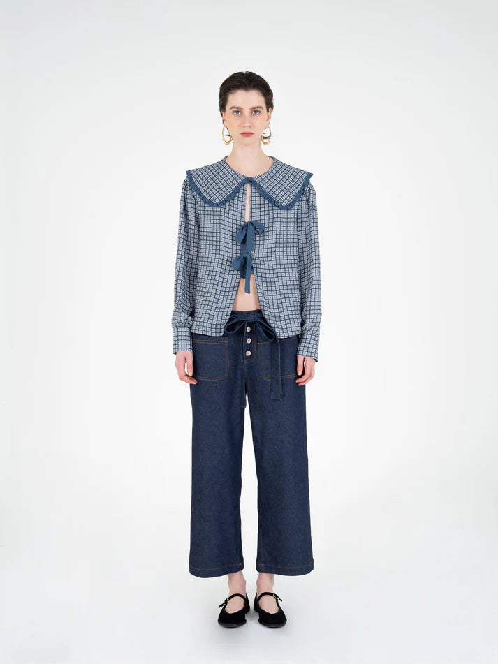 Blusa de manga larga. Cuello babero maxi con detalle de volante en tejido estampado. Mangas abullonadas y puño cerrado con botones. Cierre con lazadas de tejido estampado.