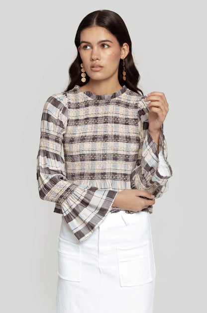 Tejido fluido. Diseño estampado. Diseño peplum. Cuello redondo. Manga larga. Puño acampanado. Panel elástico. Costuras visibles.