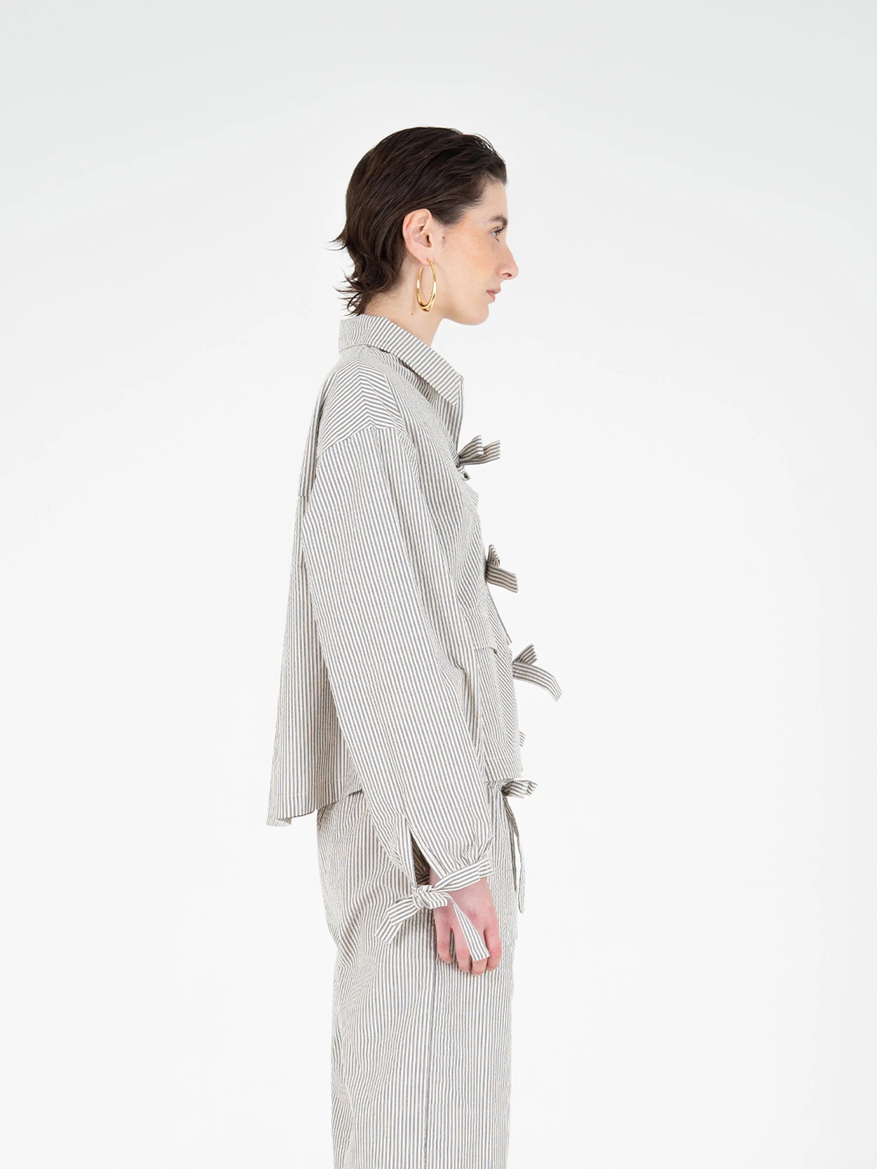Blusa estampada de manga larga, cierre con lazadas; detalle de bolsillos y cuello. Lazo decorativo en puños.