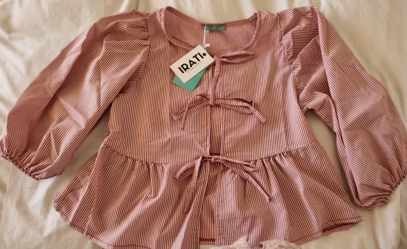 Tejido mezcla de algodón. Diseño estampado. Diseño oversize. Diseño fluido. Cuello redondo. Manga larga. Manga abullonada. Cierre lazos.