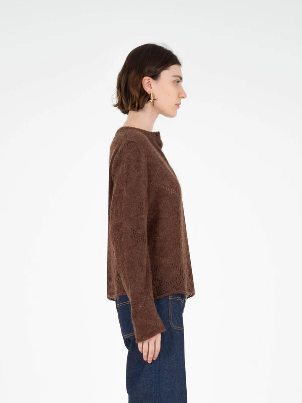 Chaleco de punto con cuello redondo. Cierre delantero con botones. Tejido calado.