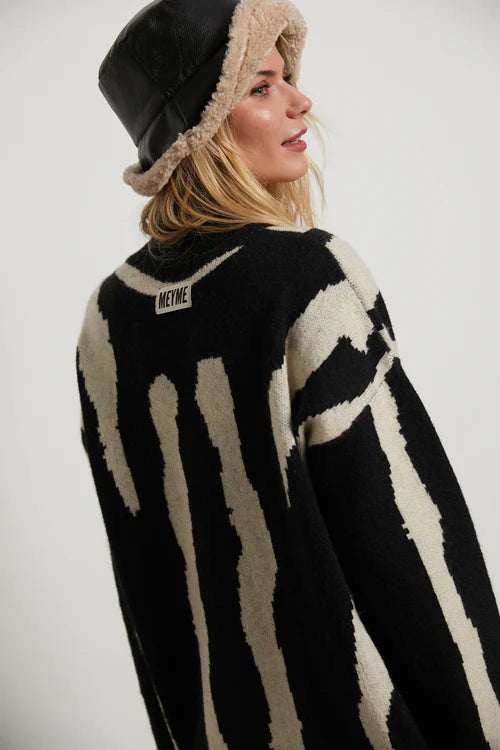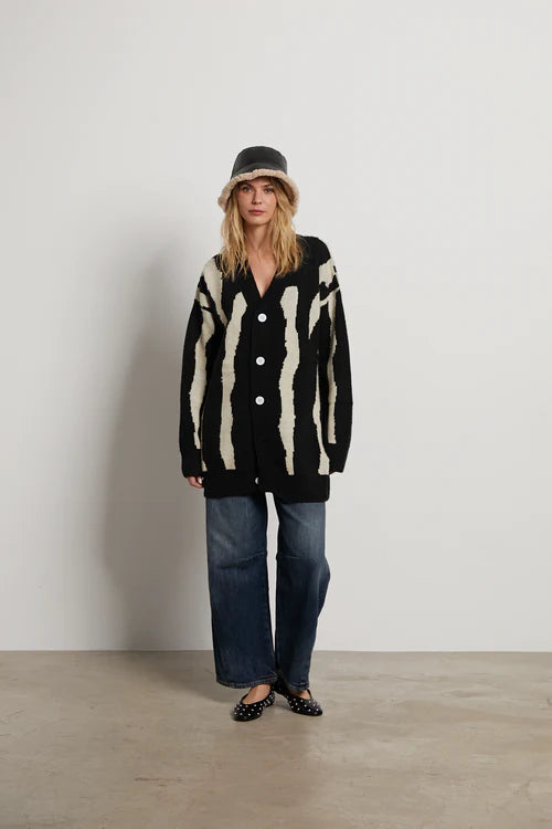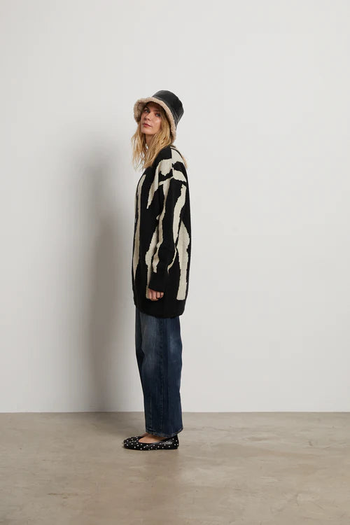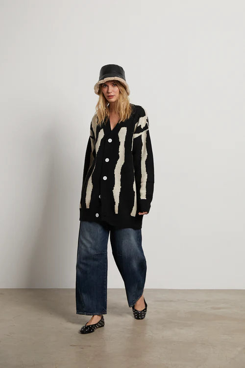 Cárdigan punto oversize negro y beige. Cuello pico. Manga larga. Cierre frontal con botones. Detalle etiqueta cosida en espalda.