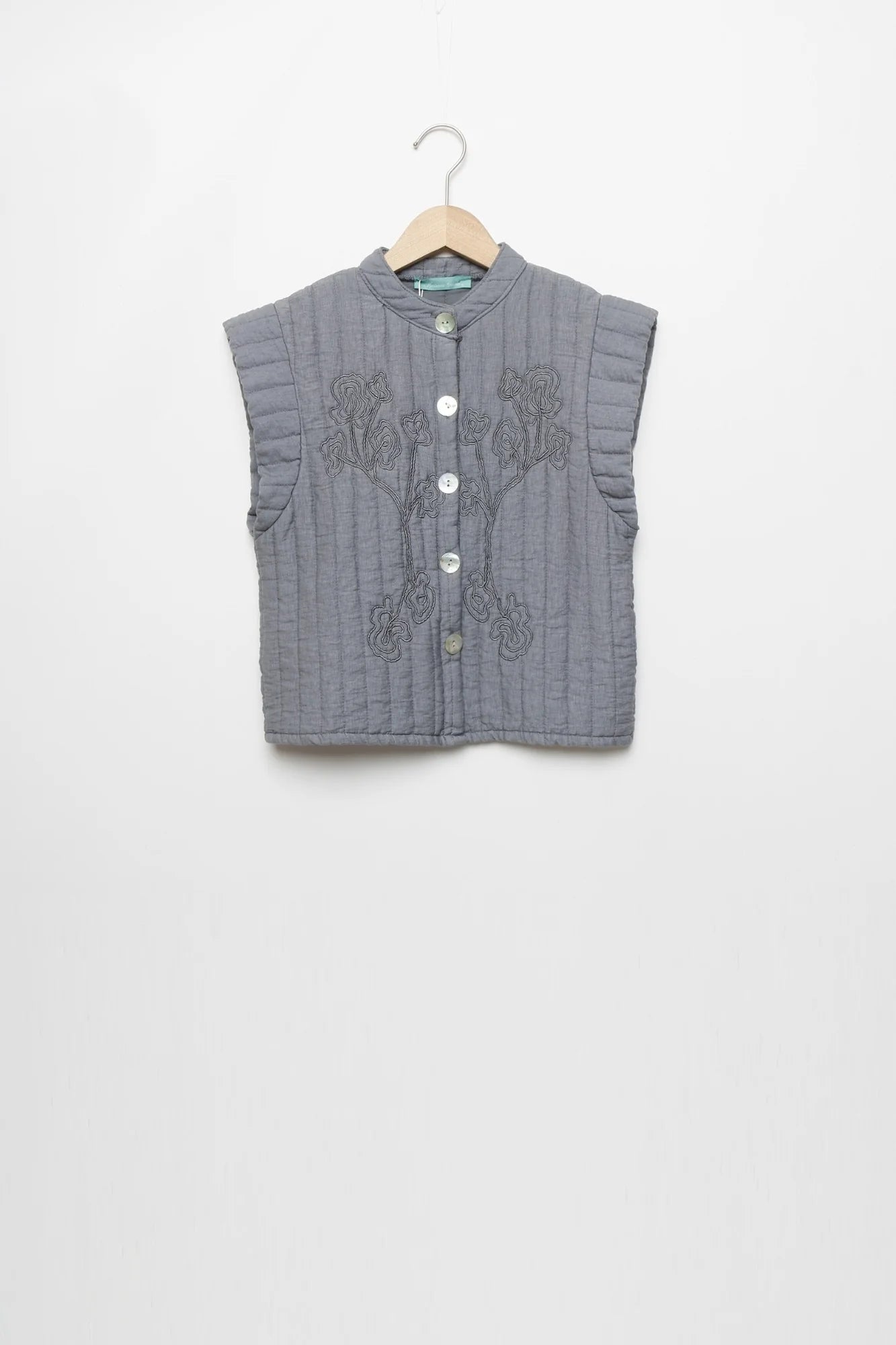 Tejido mezcla de algodón. Tejido textura. Diseño recto. Cuello redondo Manga sisa. Hombros estructurados. Cierre de botones. Sin cierre.