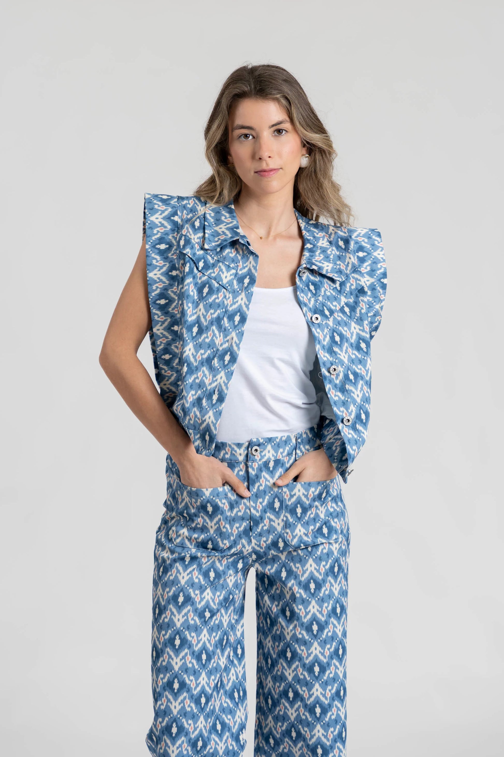 Chaqueta sin mangas. Tejido mezcla de algodón. Tejido rígido. Diseño estampado.