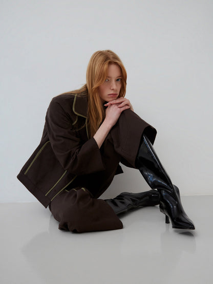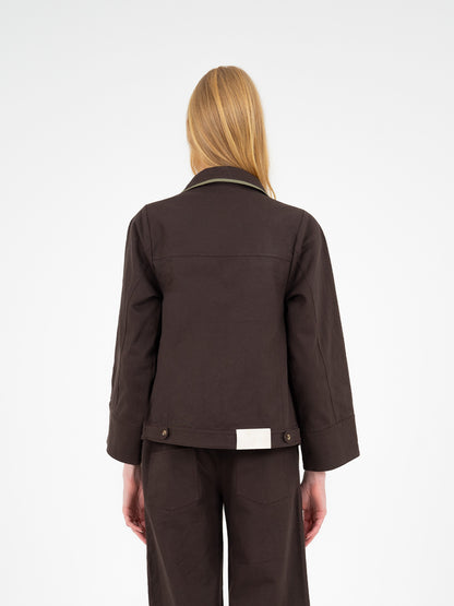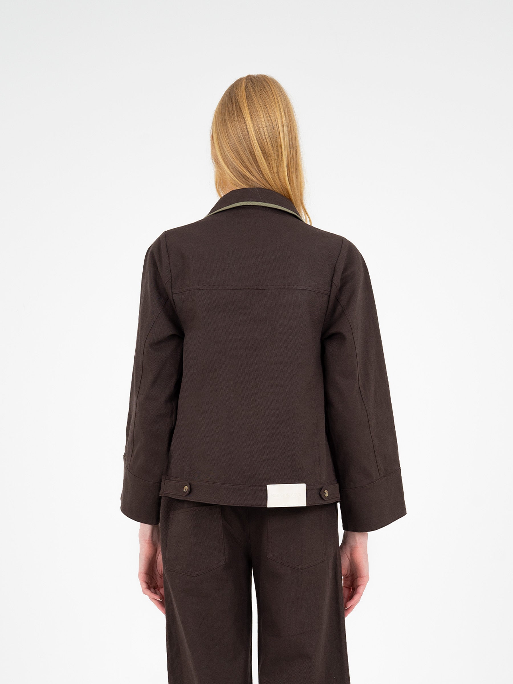 Chaqueta casual de denim en color marrón de manga larga. Corte recto con detalles de vivos en contraste. Cierre frontal con botones.