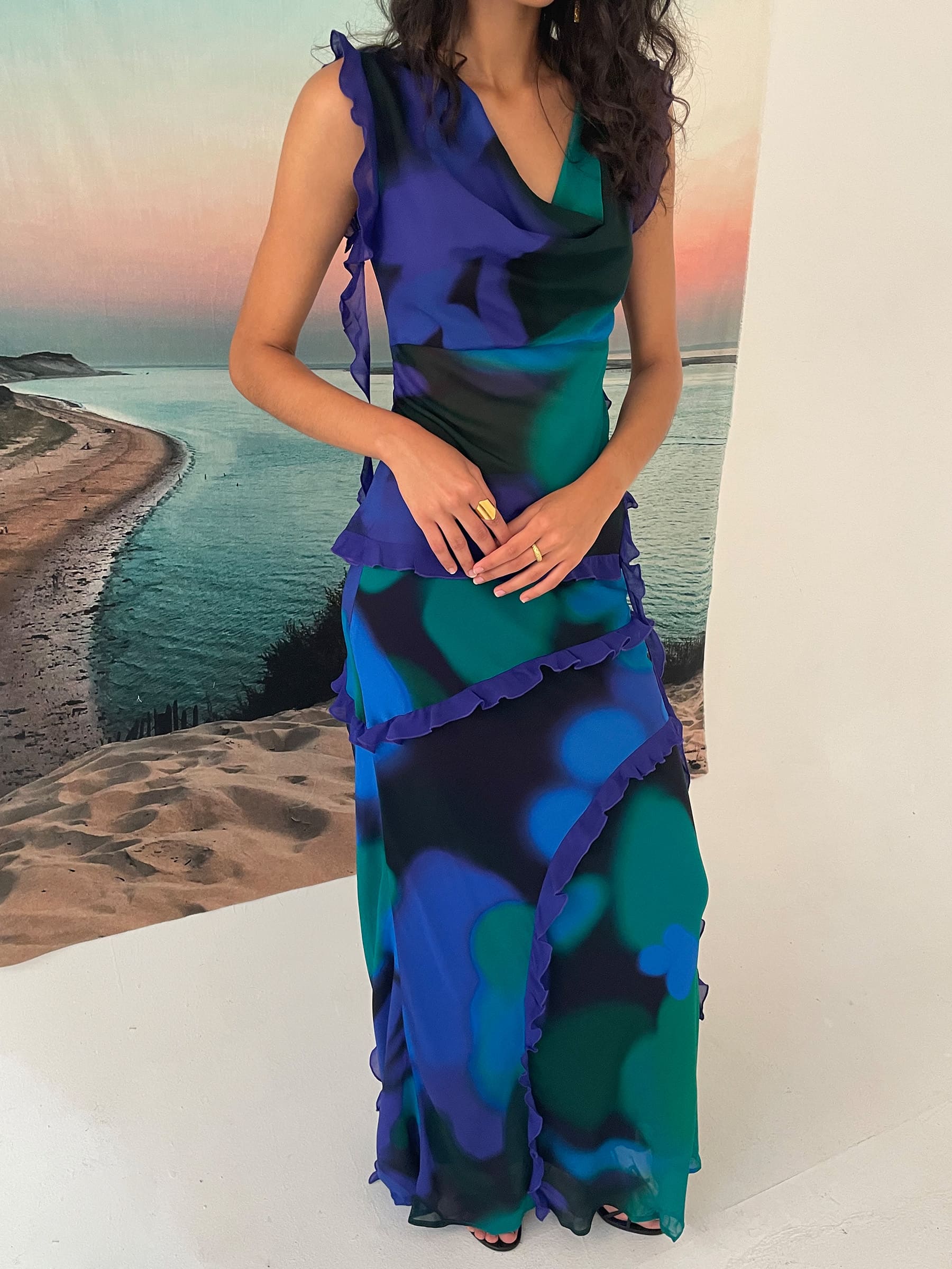 Blusa estampada sin mangas. Pequeña abertura lateral y detalles de volantes en el bajo y las mangas.