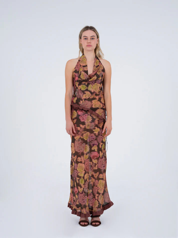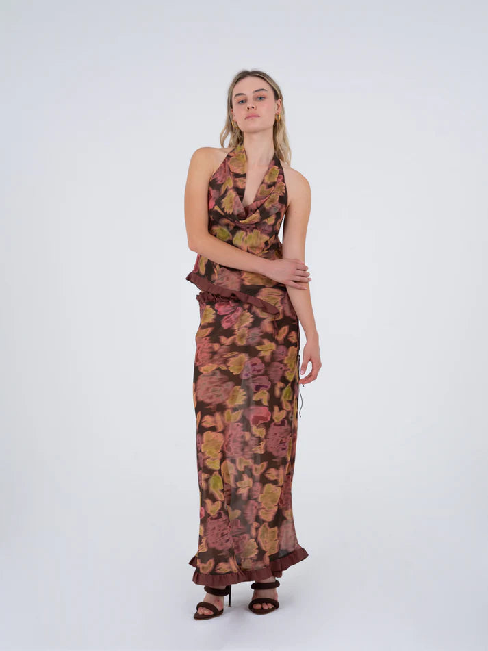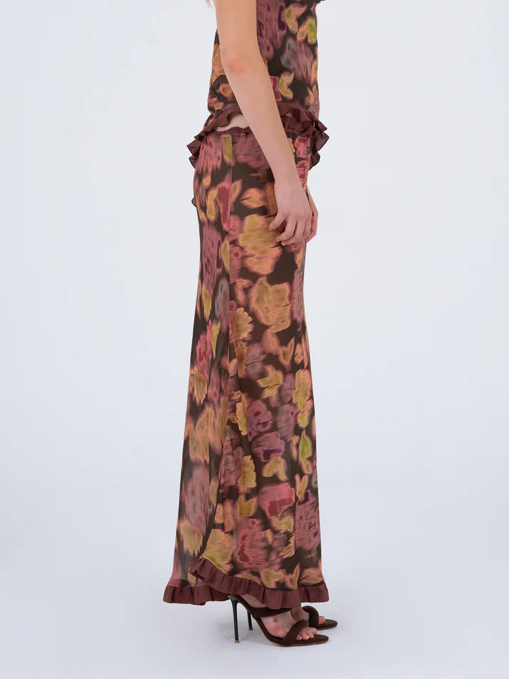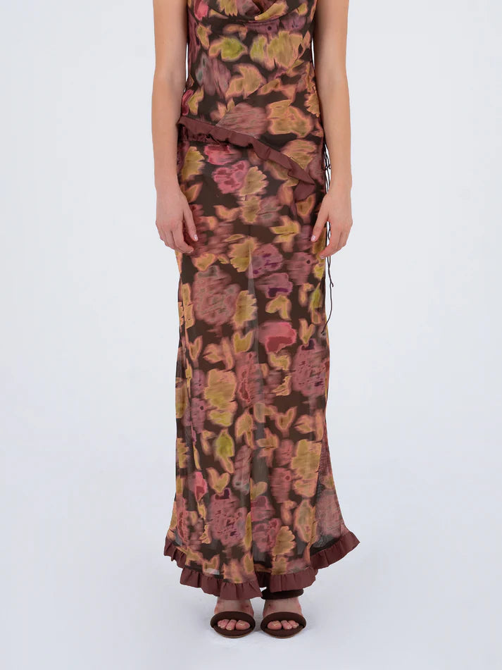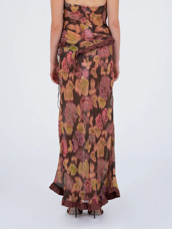 Falda larga estampada de tiro bajo. Detalle de volante en cinturilla y bajo. Cierre mediante lazada.