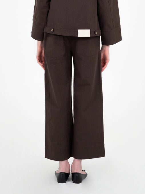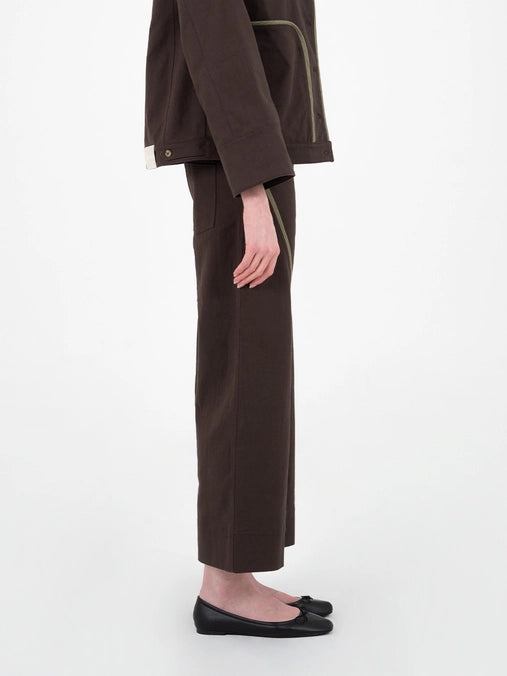 Pantalones casual denim en color café. Pantalones de pierna ancha y recta y cintura baja. Detalle de vivos en contraste.