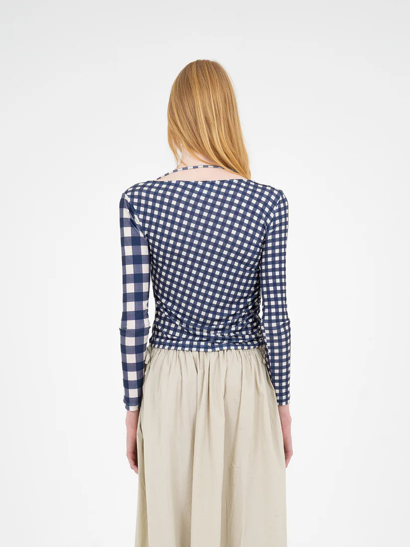 Top casual con estampado de cuadros ajustado de manga larga. Escote asimétrico. Detalle de lazos ajustables en escote.